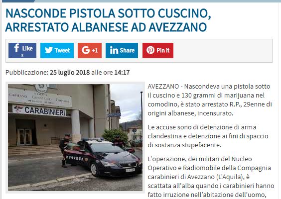 Në pranga ka përfunduar shqiptari me inicialet R.P 29 vjeç. Gjatë operacionit të policisë në banesën e shqiptarit në L’Aquila u gjet poshtë jastëkut një pistoletë dhe 130 gram marihuanë.