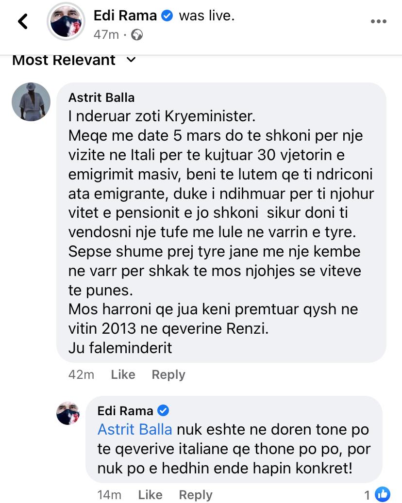 Ndërkohë një emigrant në Itali i kërkon që gjatë vizitës së tij në shtetin fqinj në mars të diskutojë me qeverinë italiane për pensionet e emigrantëve.