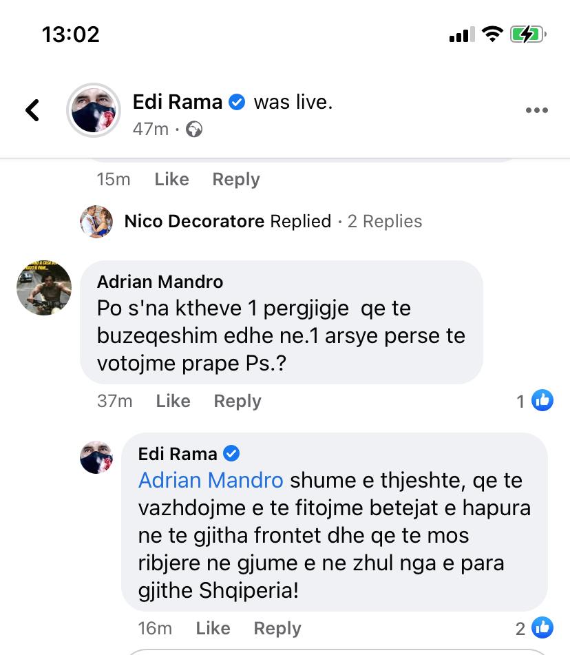 Kryeministri Edi Rama është përfshirë në debat me komentuesit në faqen e tij në facebook pas publikimit nga ana e tij të një videoje ku ai dhe kryebashkiaku Veliaj dorëzuan çelësat e radhës të banesave të reja në Farkë.