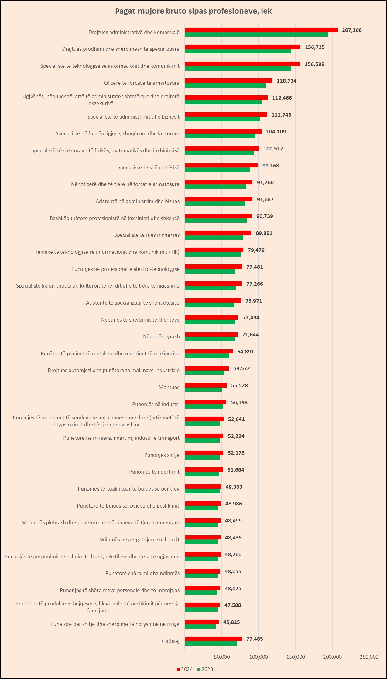 Sipas të dhënave të detajuara të INSTAT, “Drejtuesit administrativë dhe komercialë” kishin një pagë mesatare mujore bruto prej 207 mijë lekë në vitin 2024, nga 194 mijë lekë një vit më parë, me një rritje prej 6.6% në krahasim me mesataren e një viti më parë.