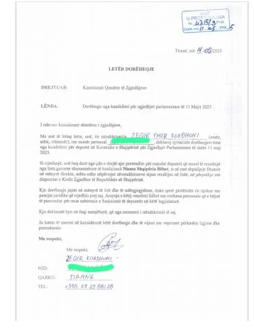 Zeqir Kordhoni, i renditur i nënti në listën e mbyllur në qarkun e Tiranës ka shprehur ambicien për të marrë mandatin e ligjvënësit. Në një shkresë depozituar në KQZ, kandidati që në CV e tij deklaruar se ka qenë punëtor ndërtimi, por që trajtohet me KEMP, duket se nuk mban mend se çfarë ka firmosur dhe i kërkon Ilirjan Celibashit informacion se çfarë ka dorëzuar partia e Adriatik Lapajt në emër të tij.
