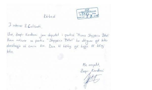 “I nderuar Z. Celibashi, unë Zeqir Kordhoni, jam deputet i partisë ‘Nisma Shqipëria Bëhet’. Kam mësuar se partia ‘Shqipëria Bëhet’ ka dërguar një letër dorëheqjeje në emrin tim. Dua të kërkoj një kopje të kësaj letre”.
