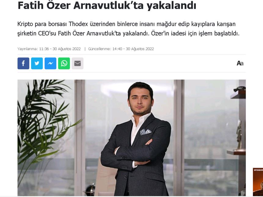 Arrestimi i Fatih Ozer, bosit të kriptomonedhës turke “Thodex” , pati jehone te menjëhershme në mediat e Turqisë, ku i riu rezulton i shumëkërkuar prej drejtësisë për akuza që bartin një dënim të gjatë me burg.