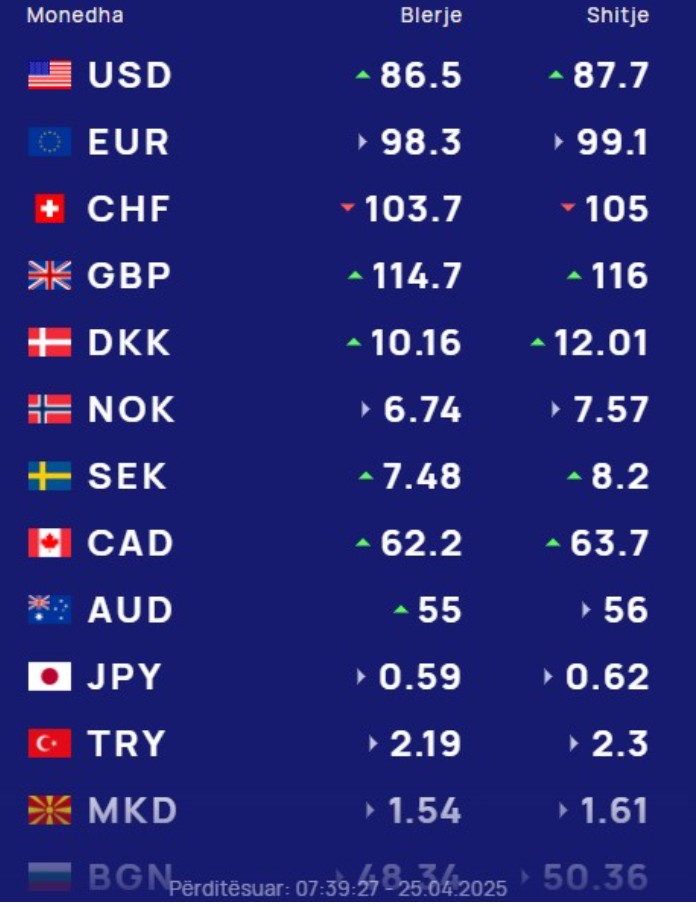 Në tregun valutor shqiptar për ditën e sotme, kurset e këmbimit janë si më poshtë: