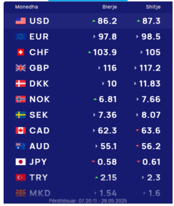 Euro do të blihet me 97.8 lekë dhe do të shitet me 98.5 lekë.