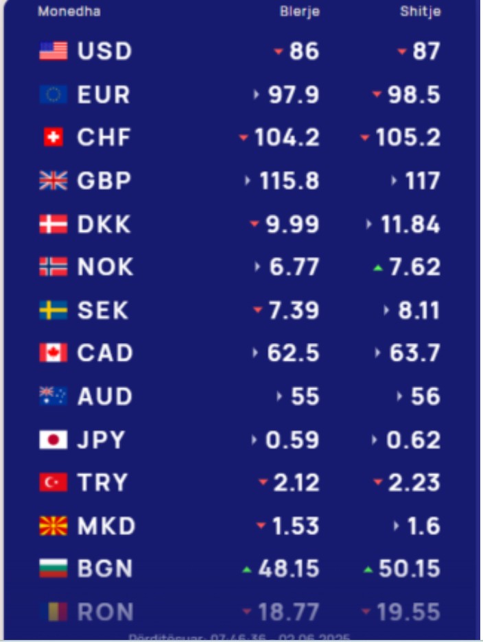 Ndërsa paundi britanik do blihet me 115.8 lekë dhe do shitet me 117 lekë.