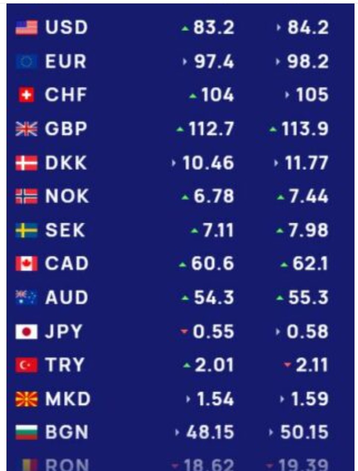 Euro do të blihet me 97.4 lekë dhe do të shitet me 98.2 lekë.