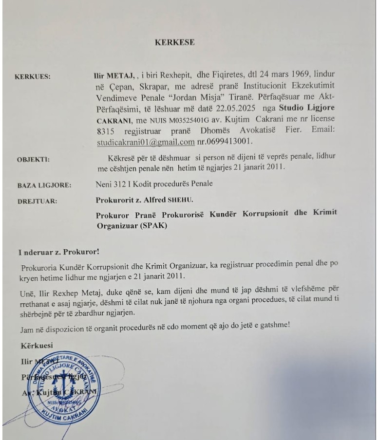 Unë, Ilir Rexhep Metaj, duke qenë se, kam dijeni dhe mund të jap dëshmi të vlefshëme për rrethanat e asaj ngjarje, dëshmi të cilat nuk janë të njohura nga organi procedues, të cilat mund ti shërbejnë për të zbardhur ngjarjen. Jam në dispozicion të organit procedurës në çdo moment që ajo do jetë e gatshme!”, thuhet në kërkesë.