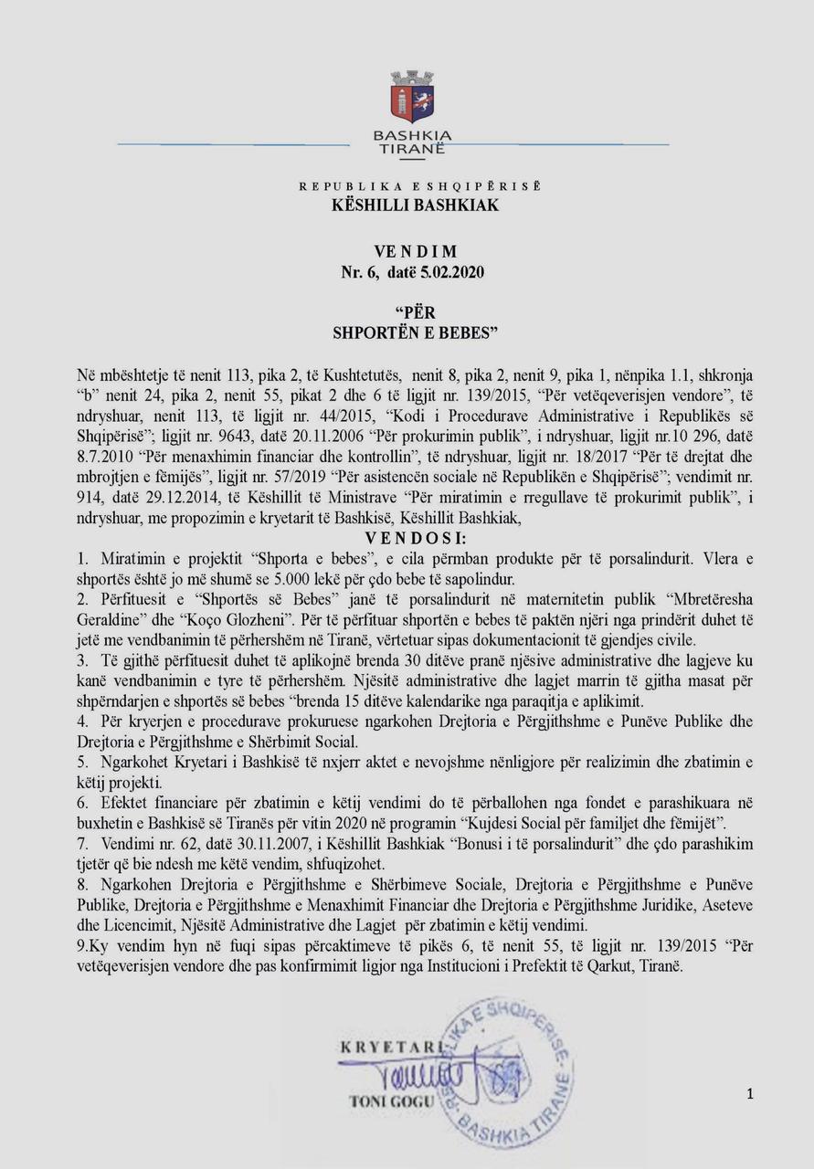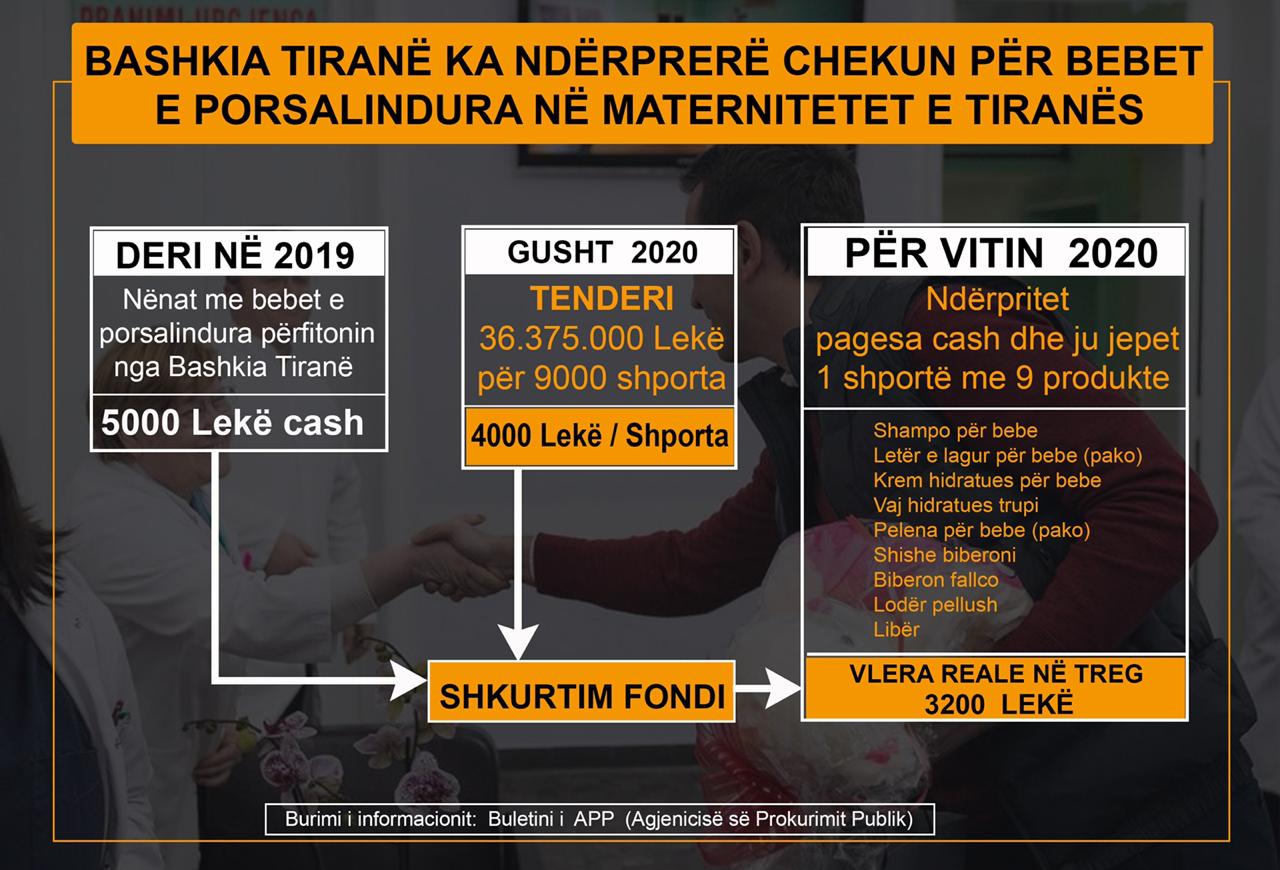 Pra, e gjithë kjo vendimmarrje është bërë vetëm e vetëm me qëllimin që nënat e fëmijëve, banorë të Tiranës të mos përfitojnë cash ato pak para për të mbaruar një punë në rastin e mirërritjes dhe shëndetit të fëmijëve të tyre. Shporta nuk mund të jetë kurrsesi zëvendësimi i parave cash në xhepat e nënave të bebeve të Tiranës.