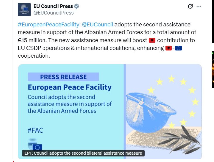 “Këshilli i Europës miraton masën e dytë të ndihmës në mbështetje të Forcave të Armatosura Shqiptare me një shumë totale prej 15 milionë eurosh. Masa e re e ndihmës do të rrisë kontributin në operacionet e CSDP-së të BE-së dhe koalicionet ndërkombëtare, duke forcuar bashkëpunimin”, thuhet në njoftimin zyrtar të publikuar nga zyrat qendrore në rrjetin social X.