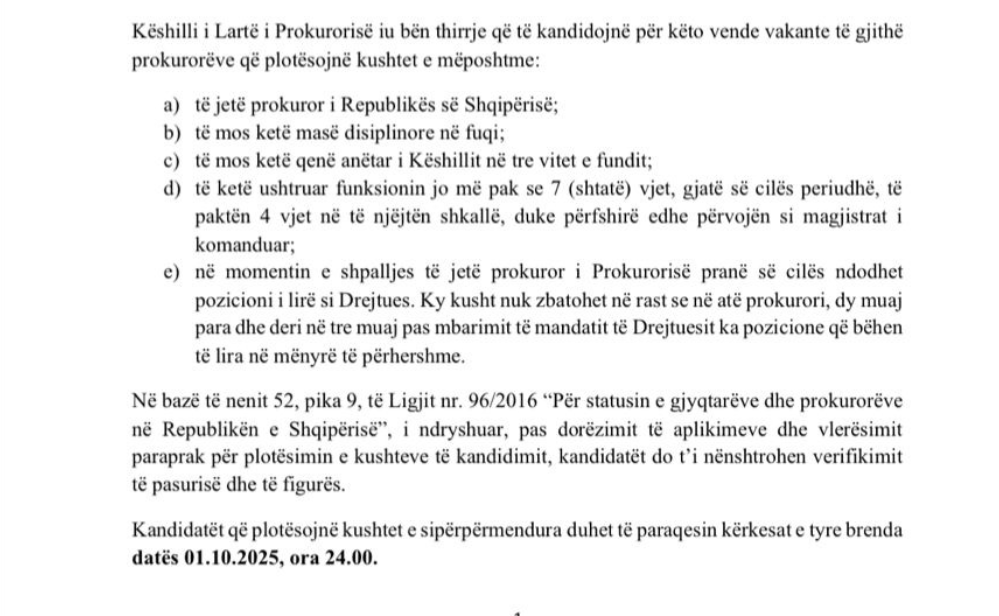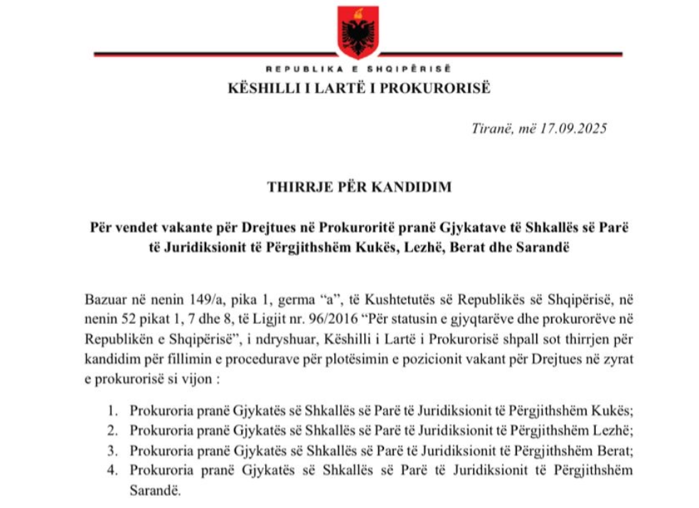 Këshilli i Lartë i Prokurorisë (KLP) hap garën për krerët e prokurorive të rretheve Kukës, Lezhë, Berat, Sarandë për “vende vakant” me një “thirrje për kandidim”.