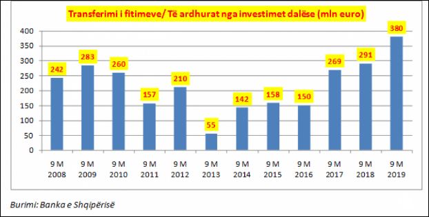 Kompanitë e huaja, që veprojnë në Shqipëri kanë transferuar një nivel rekord fitimesh për 9 muajt e këtij viti. Sipas të dhënave të raportuara nga Banka e Shqipërisë, në Bilancin e Pagesave, zëri i investimeve dalëse, që kryesisht është transferim i fitimeve, arriti në 380 milionë euro, me një rritje prej 30% në krahasim me të njëjtën periudhë të një viti më parë.
