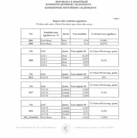 KQZ i ka kthyer përgjigje kërkesës së deputetit të PS-së, Erion Braçe, i cili kishte kërkuar informacion zyrtar mbi rezultatet e tij zgjedhore ndër vite. Institucioni ka bërë publike të dhënat që lidhen me performancën elektorale të Braçes për periudhën 2001-2021, duke evidentuar mbështetjen e vazhdueshme që ai ka marrë nga votuesit.