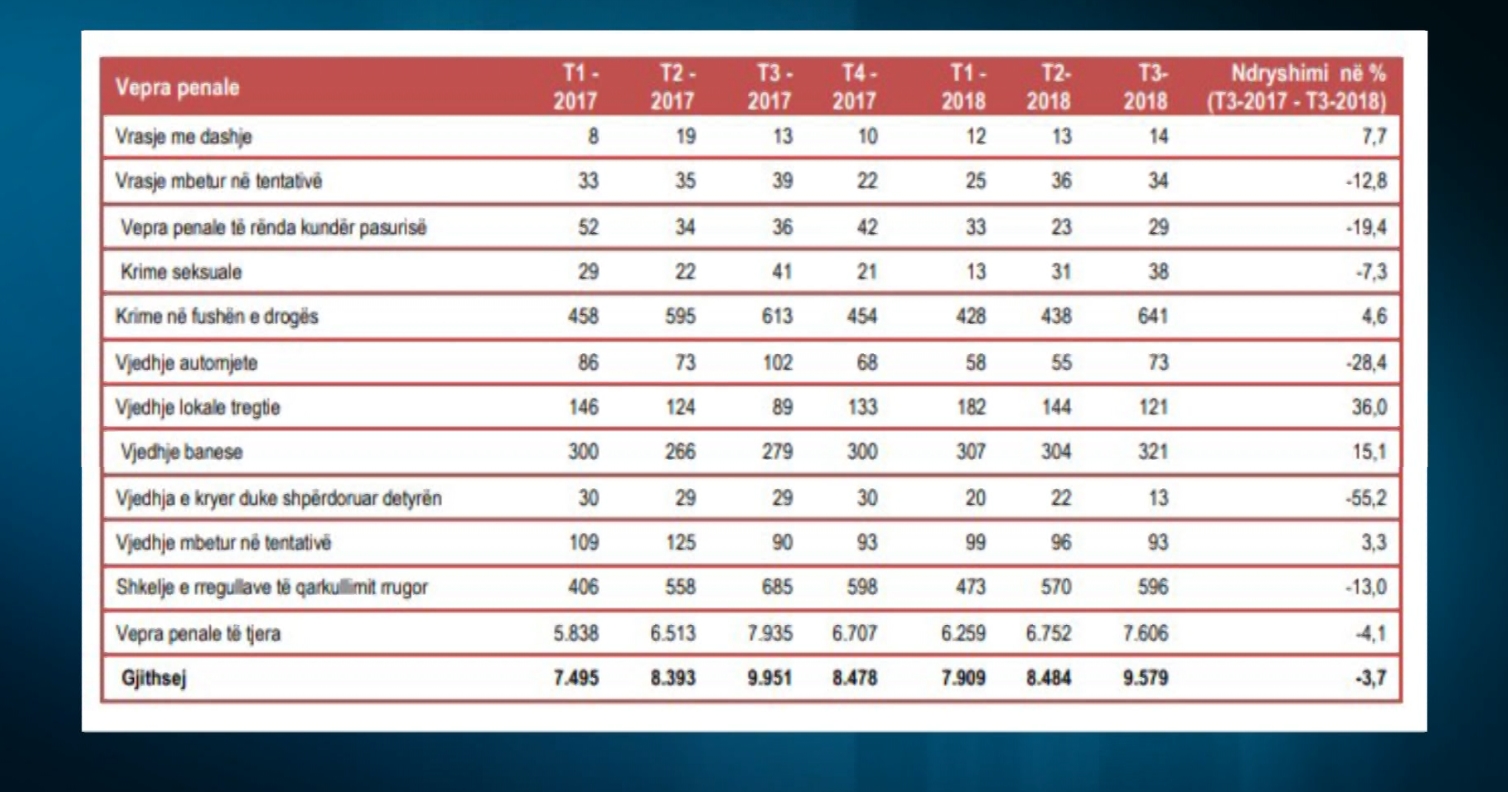 Droga, vjedhja e banesave, vjedhja e aktiviteteve tregtare janë ndër krimet që përgjatë tremujorit të tretë të 2018 kanë shënuar rritje. Ndalur tek vrasjet ato janë 14 persona një më shumë nga 13 persona të vrarë në të njëjtën periudhë të 2017-ës përfshirë muajt korrik-gusht-shtator. Këto shifra janë bërë publik nga Instituti i Statistikave në buletinin e statistikave të krimeve, ku rezulton se janë shënuar 9579 vepra penale në total me një rënie krahasuar me 2017. Por numri i vrasjeve është më i lartë, krime këto të kryera me dashje.