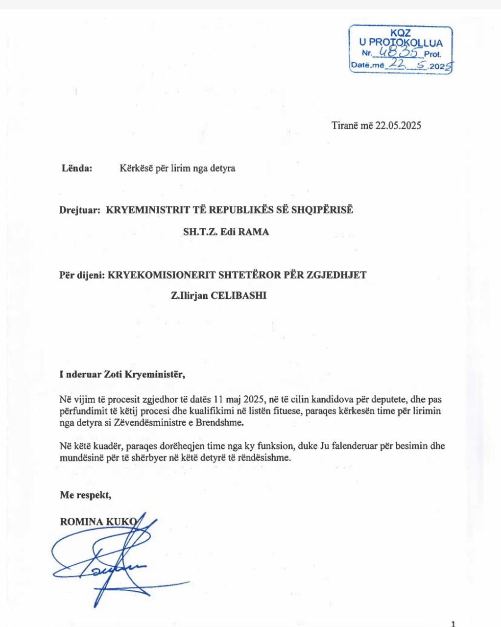 Kandidatja e listës së sigurt të PS-së në qarkun e Korçës, Romina Kuko ka dhënë dorëheqjen nga detyra si zv/ministre e Brendshme. Në një kërkesë drejtuar kryeministrit Edi Rama dhe për dijeni Kryekomisionerit Ilirjan Celibashi, Kuko ka njoftuar largimin nga detyra duke falënderuar për besimin dhe mundësinë për të shërbyer në këtë funksion. Me dorëheqjen nga ekzekutivi, ajo i hap rrugë uljes në Kuvend si përfaqësuese e mazhorancës në mandatin e ri parlamentar.