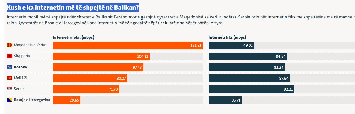 Internetin mobil më të shpejtë ndër shtetet e Ballkanit Perëndimor e gëzojnë qytetarët e Maqedonisë së Veriut, ndërsa Serbia prin për internetin fiks me shpejtësinë më të madhe në rajon. Qytetarët në Bosnje e Hercegovinë kanë internetin më të ngadaltë nëpër celularë dhe nëpër shtëpi e zyra, shkruan radio Europa e Lirë.