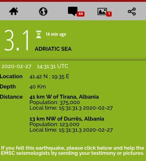 Vijojnë lëkundjet e tokës në Shqipëri. Para pak minutash është regjistruar një tjetër tërmet me magnitudë 3.1 ballë i shkallës Rihter. Epiqendra ishte sërish në Detin Adriatik. Nuk raportohet për dëme materiale. Lëkundje me magnitudë 3.0 ballë po në Adriatik pati edhe mbrëmjen e djeshme.