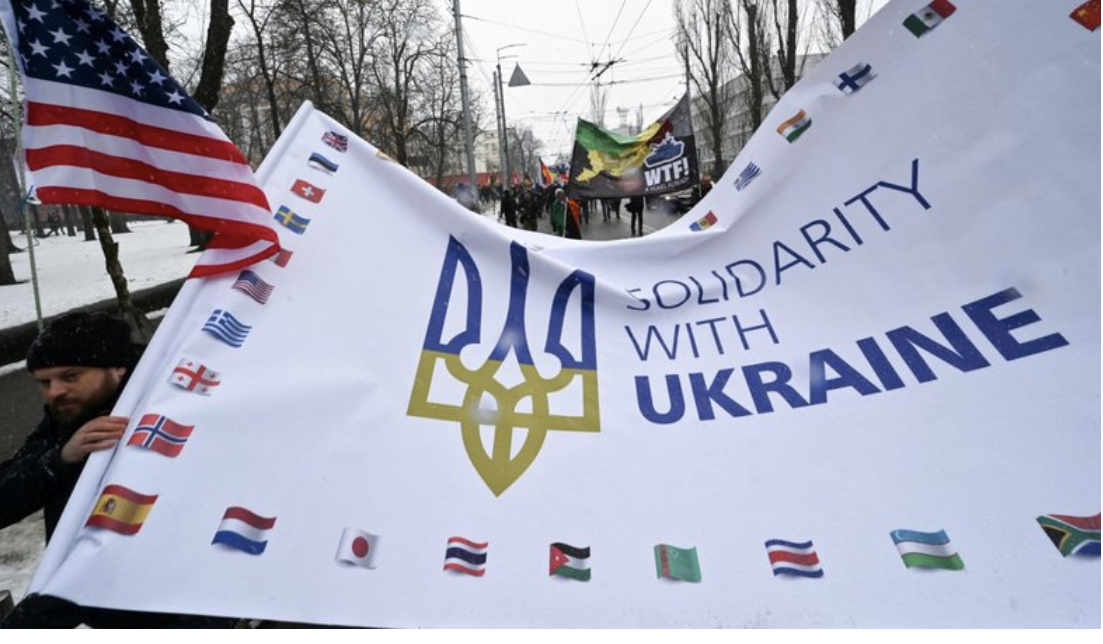 Ukrainasit dolën nëpër qendrën e Kievit në një kolonë, duke brohoritur “Lavdi Ukrainës” dhe duke mbajtur flamuj ukrainas dhe pankarta që thoshin “Ukrainasit do të rezistojnë” dhe “Pushtuesit duhet të vdesin”.