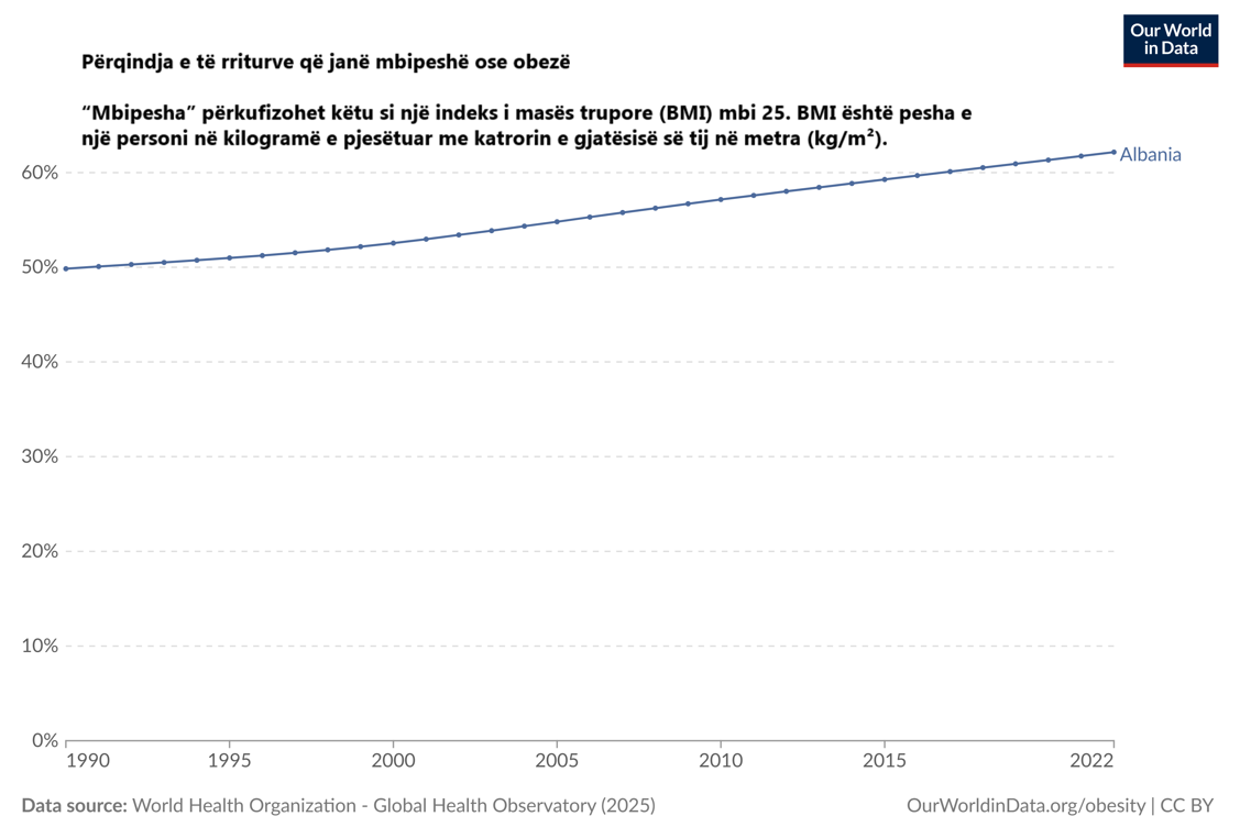 Përqindja e të rriturve në Shqipëri që janë mbipeshë ose obezë është rritur ndjeshëm gjatë tre dekadave të fundit, duke kaluar nga rreth 50% në vitin 1990 në mbi 62% në vitin 2022, sipas të dhënave më të fundit të disponueshme të World Health Organization – Global Health Observatory (2025), të përpunuara nga Our World in Data.