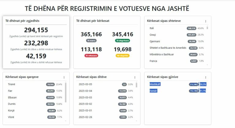 Sipas të dhënave të publikuara në faqen zyrtare të KQZ, 294.155 shqiptarë që jetojnë jashtë vendit kanë aplikuar për t’u regjistruar, ndërkohë që janë miratuar 232.298 e kërkesave dhe janë refuzuar 42.159 e tyre.
