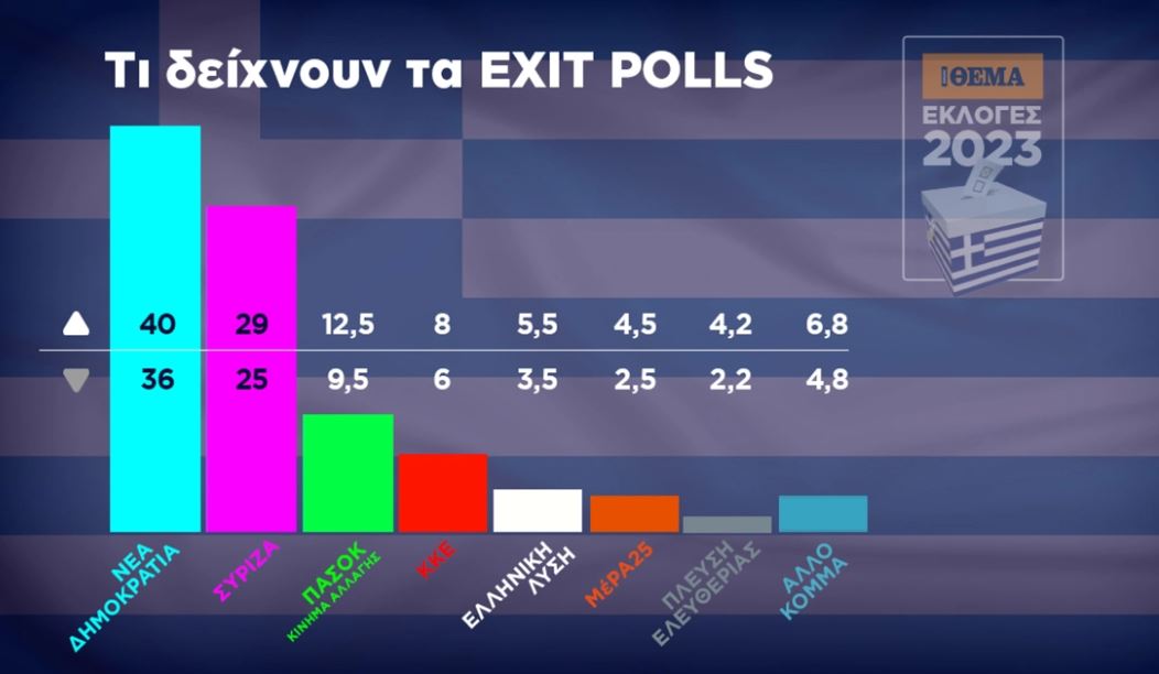 Exit poll-i i përbashkët i miratuar nga të gjitha kompanitë e sondazheve dhe të gjitha stacionet televizive tregon se epërsia e ND ndaj SYRIZA- s mund të arrijë në 11 pikë në zgjedhje. Sipas mediave vendase referuar rezultateve të exit poll-it mësohet se Demokracia e Re e Kyriakos Mitsotakis pritet të marrë nga 36% deri në 40%.