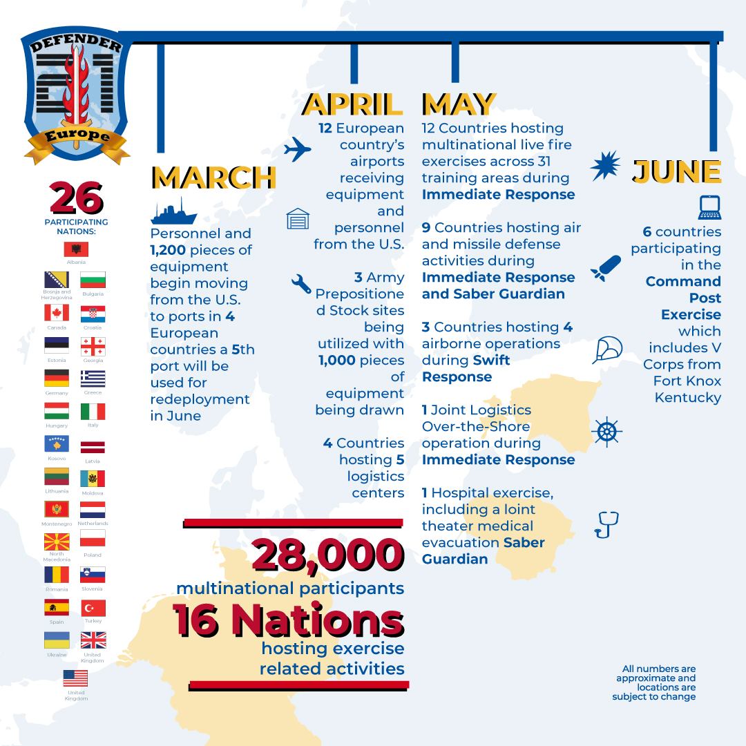 Komanda e Ushtrisë Amerikane në Europë (USAEUR) do të drejtojë paketën e stërvitjeve të koduar “Defender Europe 21” dhe pjesë e kësaj pakete do të jetë pjesëmarrja e forcave të vendeve aleate dhe partnere, si: Kanadaja, Bosnjë dhe Hercegovina, Kroacia, Greqia, Kosova, Mali i Zi, Maqedonia e Veriut, Britania e Madhe, Çekia, Hungaria, Rumania, Bullgaria, Gjeorgjia, Turqia etj.