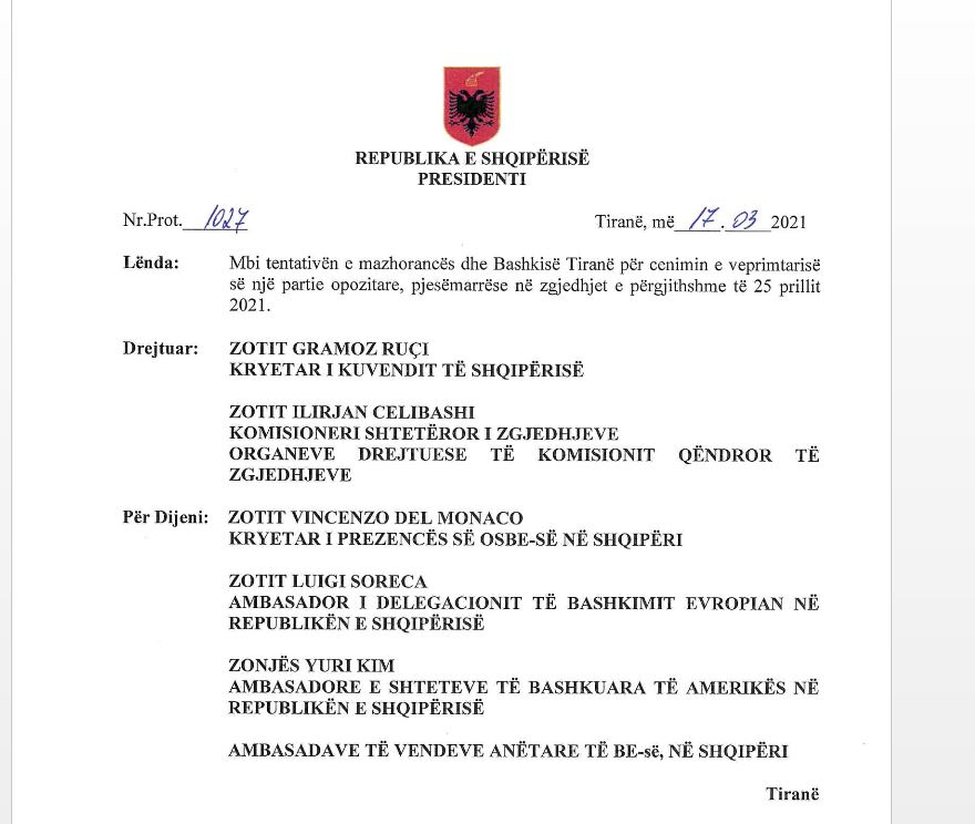 “Siç dhe jeni njohur me zhvillimet e fundit, përmes medias së shkruar, elektronike dhe vizive, situata politike parazgjedhore dhe klima e besimit ndërmjet forcave politike garuese në zgjedhjet e përgjithshme të 25 prillit, është cenuar rëndë.