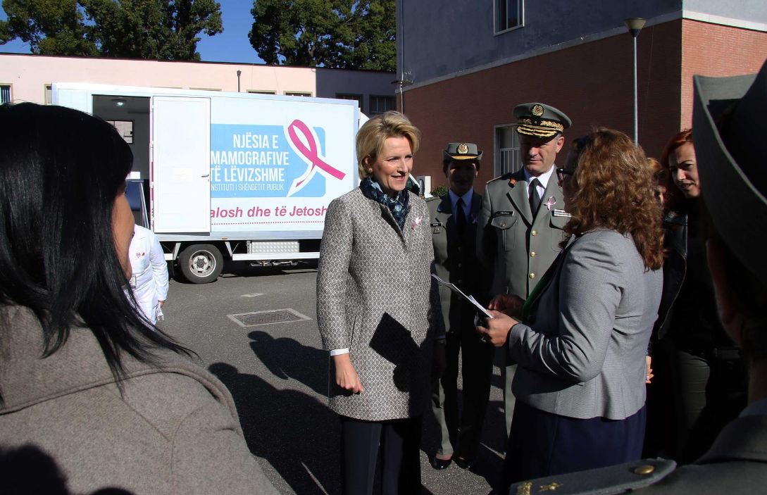Në kuadër të muajit të sensibilizimit kundër kancerit të gjirit, nën kujdesin e veçantë të ministres së Mbrojtjes, znj. Mimi Kodheli në ambientet e Ministrisë së Mbrojtjes për një javë të plotë është në dispozicion të grave ushtarake dhe civile një makinë lëvizëse për kryerjen e mamografisë falas. Në ditën e dytë të vizitave mori pjesë edhe ministrja e Mbrojtjes, znj. Mimi Kodheli, e cila bashkëbisedoi me gratë që ishin të pranishme për kryerjen e ekzaminimeve.