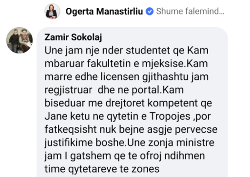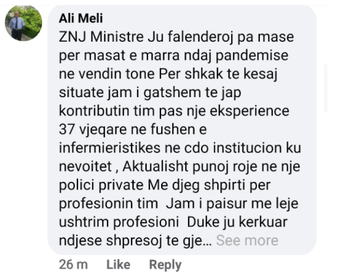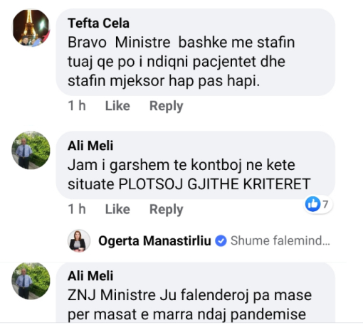 Pas thirrjes së ministres së Shëndetësisë, Ogerta Manastirliu ndaj të gjithë mjekëve, infermierëve dhe studentëve të mjekësisë që duan të japin kontributin e tyre në luftën ndaj coronavirusit duke u bashkuar me ekipet mjekësore në terren, reagimi i tyre ka qenë i jashtëzakonshëm. Në Facebookun e ministres, mjekë, infermierë e studentë mjekësie kanë treguar gatishmērinë e tyre të menjëhershme. Ministrja dhe sta i saj i ka falenderuar dhe i ka orientuar që të vazhdojnë procedurën në https://mjeke.shendetesia.gov.al/ http://infermierepershqiperine.al/.