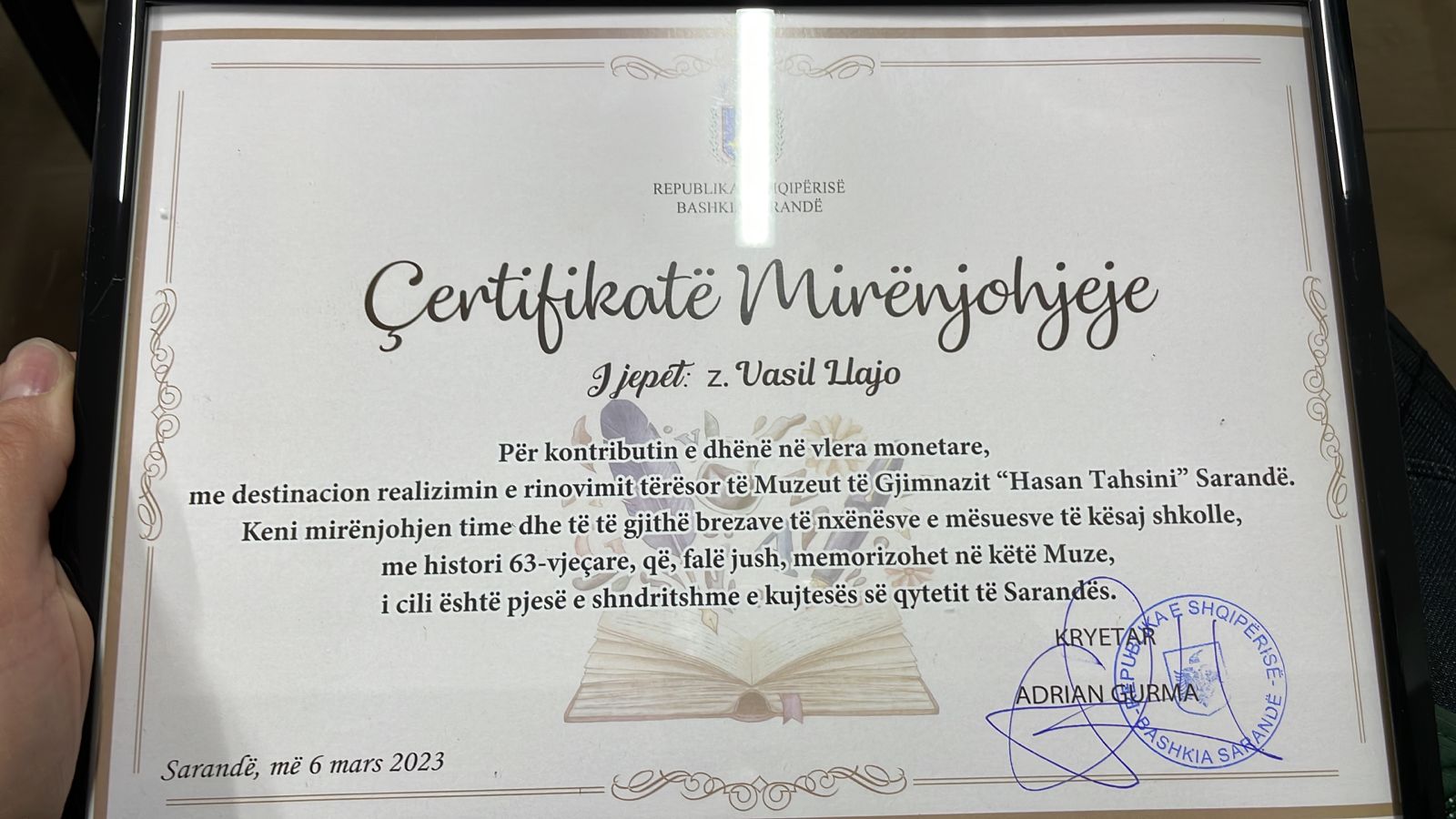 Mjeku Vasil Llajo merr certifikatën e Mirënjohjes nga bashkia e Sarandës