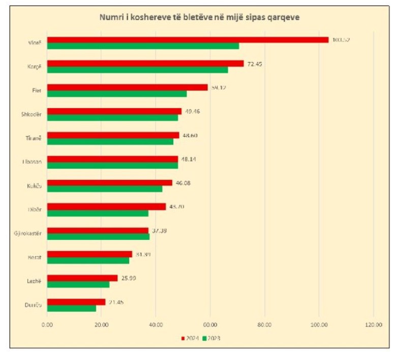 Të dhënat tregojnë se Vlora rezulton të jetë qarku me rritjen më të madhe. Numri i koshereve në këtë qark, nga 70.54 mijë në 2023 arriti në 103.52 mijë në 2024, me rritje 46.75%.