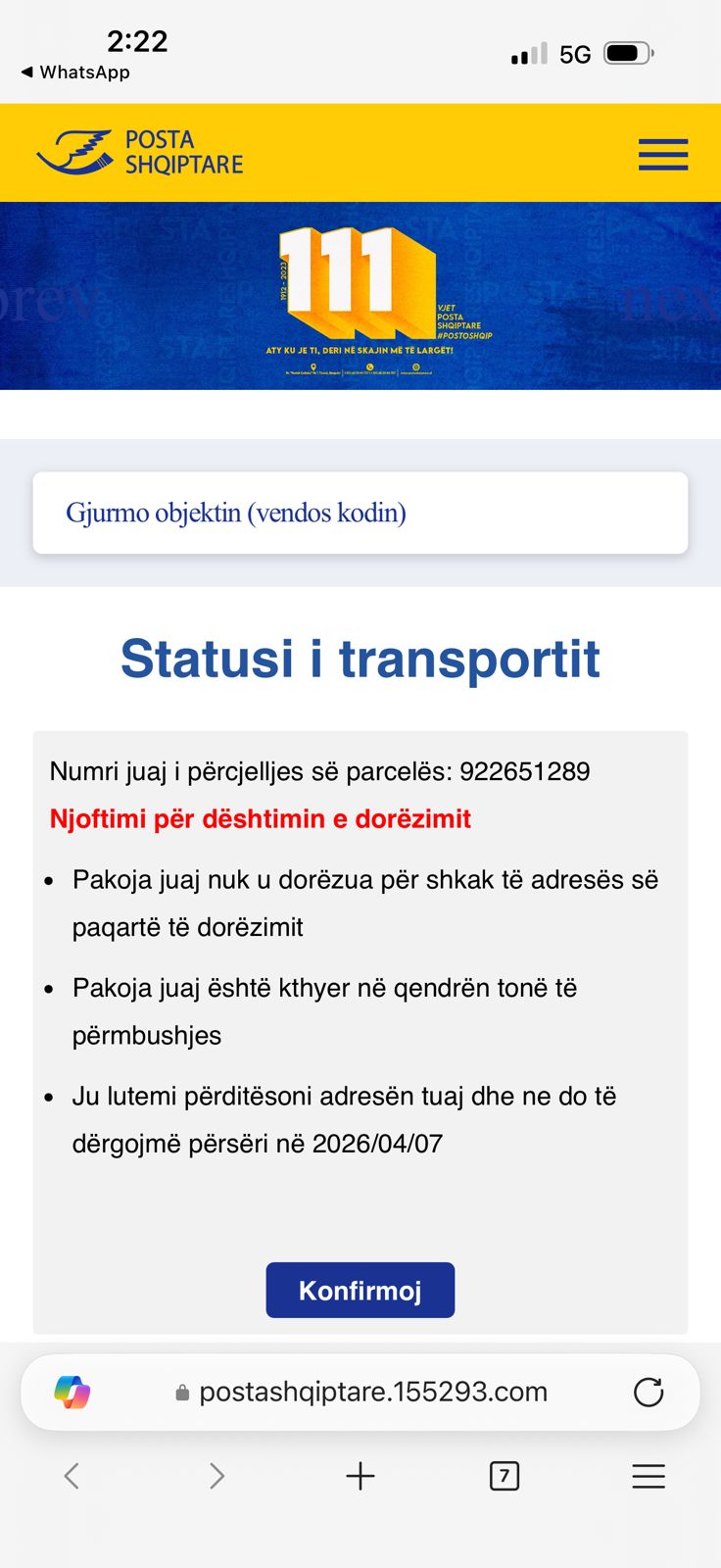 Drejtoria për Hetimin e Krimeve Kibernetike në Policinë e Shtetit ka ngritur alarmin për përhapjen e mesazheve SMS mashtruese, të cilat paraqiten në mënyrë të rreme si njoftime nga shërbimet postare për dorëzimin e paketave. Këto mesazhe përmbajnë lidhje të dyshimta dhe u kërkojnë qytetarëve të ndërmarrin veprime urgjente, duke krijuar ndjesinë e një situate të menjëhershme që kërkon reagim.