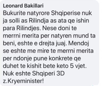 Bukuritë natyrore Shqipërisë nuk ja solli Rilindja as ata që ishin para Rilindjes. Nëse doni të merrni merita për natyrën mund ta bëni, është e drejta juaj. Mendoj se është më mirë të merrni merita për ndonjë punë konkrete që duhet të kishit bërë këto 5 vjet. Nuk është Shqipëria 3D zoti Kryeministër.