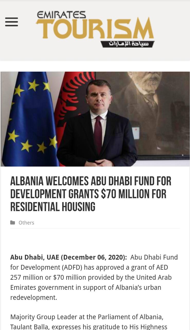 Mediat në Abu Dhabi dhe Dubai i kanë bërë jehonë mbështetjes për Shqipërinë dhe Marrëveshjes së ratifikuar nga Kuvendi i Shqipërisë për Bashkëpunimin Ekonomik” mes Shqipërisë dhe Emirateve të Bashkuara Arabe, duke i dhënë rrugë njërit nga projektet më të mëdha të Rindërtimit me mbi 2000 apartamente për familjet e Durrësit.