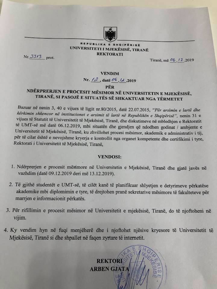 Vendimi u mor për shkak të situatës dhe gjendjes ku ndodhen godinat e UMT pas tërmetit të 26 nëntorit.