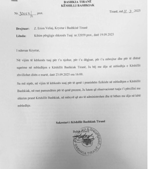 Këshilli Bashkiak i Tiranës i është drejtuar me një letër kryebashkiakut Erion Veliaj një ditë para mbajtjes së mbledhjes ku do të diskutohet për shkarkimin e tij. Letra vjen pasi Veliaj kërkoi të ishte i pranishëm në mbledhjen e Këshillit.