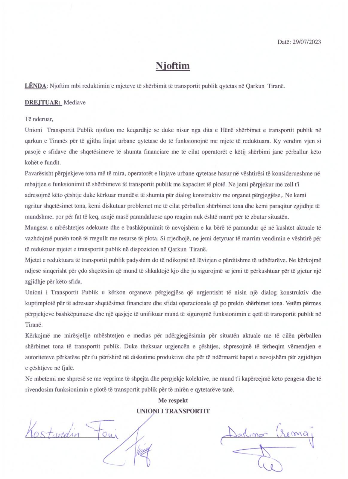 Unioni i Transportit Publik u kërkon organeve përgjegjëse që urgjentisht të nisin një dialog konstruktiv dhe kuptimplotë për të adresuar shqetësimet financiare dhe sfidat operacionale që po prekin shërbimet tona. Vetëm përmes përpjekjeve bashkëpunuese dhe një qasjeje të unifikuar mund të sigurojmë funksionimin e qetë të transportit publik në Tiranë.