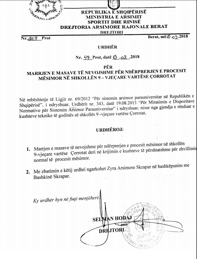 Përmes një postimi në Facebook, ministrja Nikolla thotë se bëhet fjalë për shkollën vartëse me një klasë të vetme në fshatin Çorrotat, e cila në 15 shkurt 2018 është mbyllur për arsye sigurie.