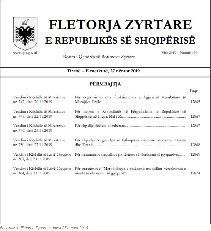 Por që prej miratimit të ligjit qeveria nxori me disa muaj vonesë aktin nënligjor për funksionimin e kësaj Agjencie, e cila suprimonte strukturën, Drejtorinë e Përgjithshme të Emergjencave Civile. Pikërisht më 20 nëntor qeveria mori dy vendime. Pas afro një muaj pas tërmetit të 21 shtatorit, edhe 6 ditë përpara tërmetit “apokaliptik”, emëroi drejtorin e kësaj Agjencie, Haki Çakon, si dhe miratoi VKM-në e posaçme për mënyrën e funksionimit të këtij institucioni. Por VKM-ja e 20 nëntorit është publikuar nga Qendra e Botimeve Zyrtare më 27 nëntor, një ditë pas tërmetit prej 6,4 ballësh.