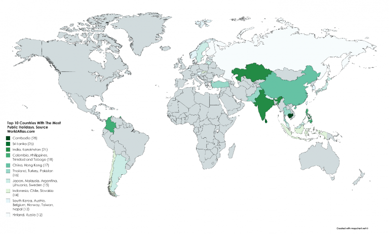 Në një hartë të re të përpiluar nga WorldAtlas, rezulton se nga të gjitha vendet në botë, Kamboxhia kryeson listën e festave më të zakonshme me 28 festat publike të vërejtura çdo vit. Sri Lanka ndjek me 25, Indi dhe Kazakistan me 21, Kolumbi, Filipine dhe Trinidad dhe Tobago me 18, Kinë dhe Hong Kong me 17, dhe Tajlandë, Turqi dhe Pakistani me 16.
