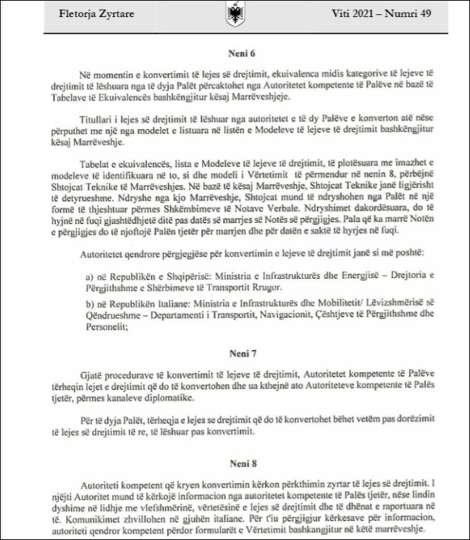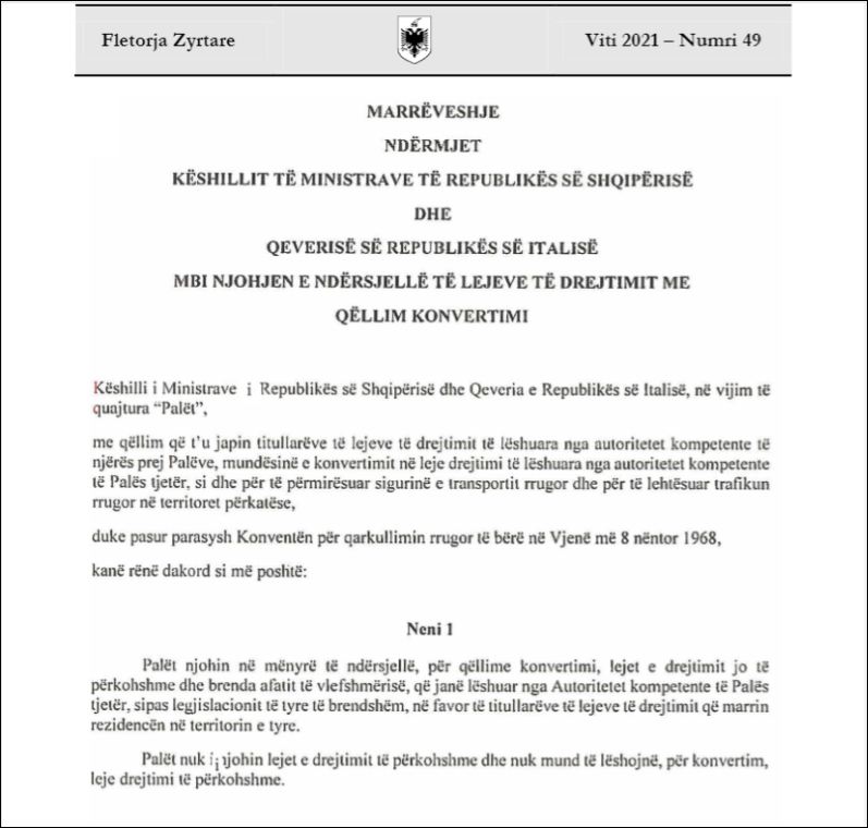 Me këtë vendim, të gjithë shtetasit shqiptarë që kanë marrë një leje drejtimi në Shqipëri dhe që vizitojnë shtetin përtej Adriatikut ose punojnë do të kryejnë konvertimin e patentës pa patur nevojë për prova teorike dhe praktike.
