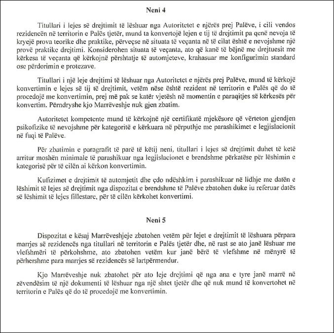 “Marrëveshja do të ketë një kohëzgjatje prej 5 vjetësh. Duke filluar një vit para përfundimit të afatit, palët do të fillojnë konsultimet për të vijuar me rinovimin e kësaj marrëveshjeje, në mënyrë që të mos ndodhë ndërprerja, qoftë edhe e përkohshme, e konvertimit të lejeve të drejtimit“, thuhet ndër të tjera në vendim.