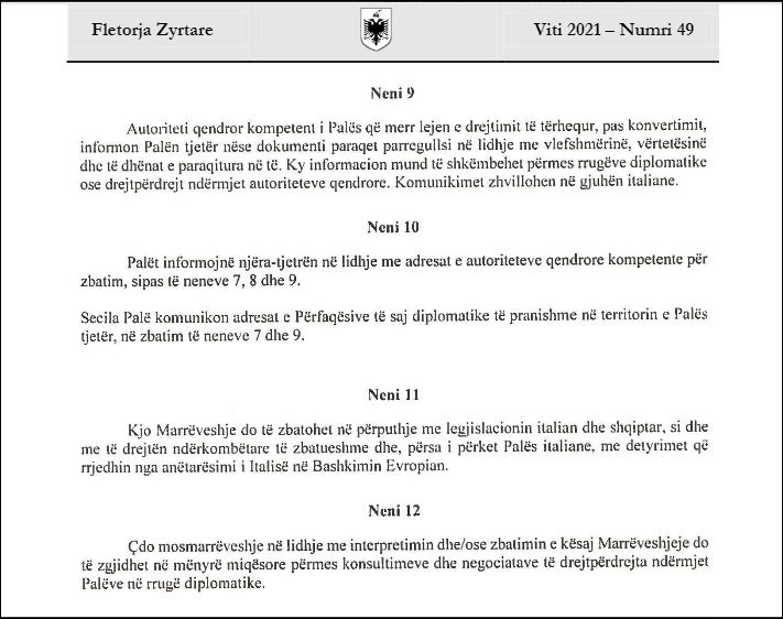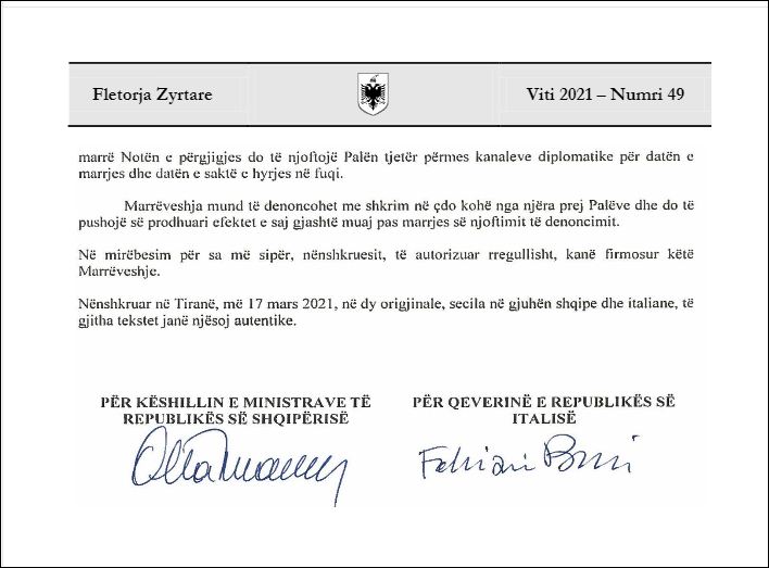 Marrëveshja u nënshkrua pak ditë më parë në Tiranë nga ministrja e Jashtme, Olta Xhaçka ndërsa për palën italiane nga ambasadori i Italisë në vendin tonë, Fabrizio Bucci.