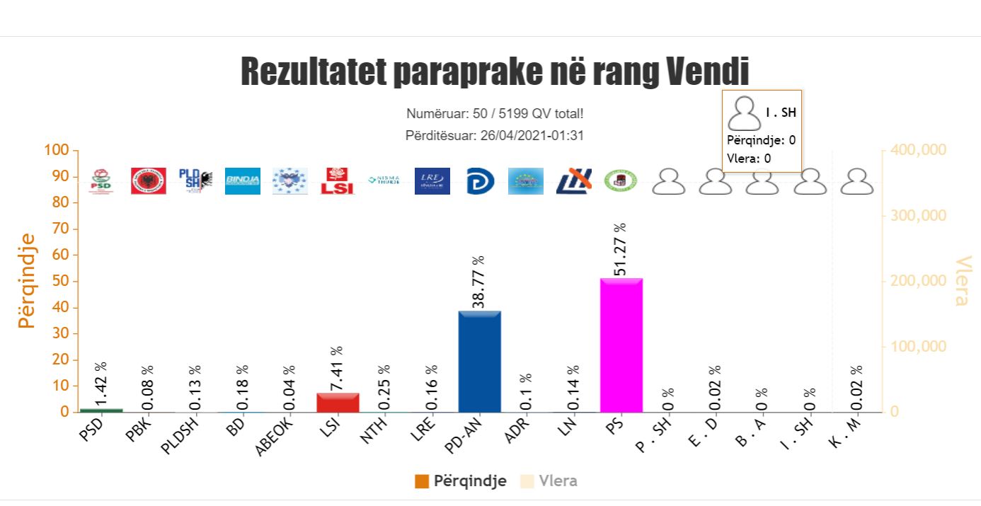 Po ashtu sipas KQZ-së, deri më tani, PS ka 51.2% të votave, PD 38.7%, LSI 7.41% dhe PSD 1.42%
