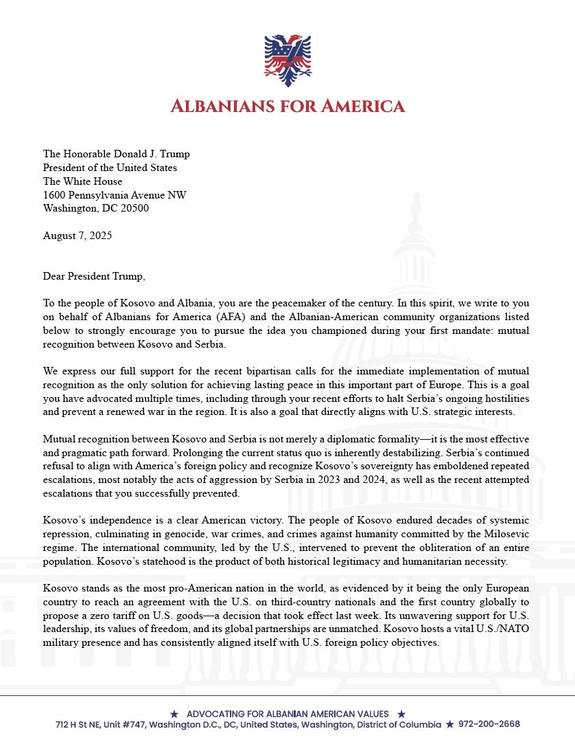“Për popujt e Kosovës dhe Shqipërisë ju jeni paqebërësi i shekullit,” nis letra e organizatave shqiptare në Amerikë. Ato theksuan se Serbia ka neglizhuar zbatimin e disa prej pikave kritike të Marrëveshjes së Uashingtonit dhe “vazhdon të forcojë aleancat me kundërshtarët e Amerikës, si Rusia, Kina dhe Irani, duke cenuar kështu përpjekjet për bashkëpunim rajonal të ngushtë dhe duke kërcënuar interesat amerikane”.