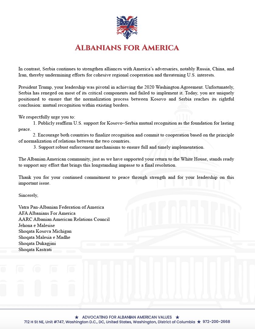 Letra e firmosur nga organizata Shqiptarët për Amerikën (AFA) së bashku me Vatrën, AARC, Jehona e Malësisë, Shoqata Kosova Michigan, Shoqata Malësia e Madhe, Shoqata Dukagjini dhe Shoqata Kastrati, vlerësoi përpjekjet fillestare të presidentit amerikan për t’i ulur palët në tryezë në vitin 2020.