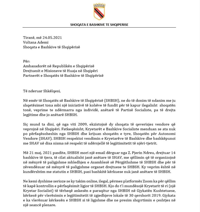 Më 21 maj, 2021 pasdite, SHBSH mori një email dërguar nga Z. Pjerin Ndreu, drejtuar 14 bashkive të tjera, të cilat aktualisht janë anëtare të SHAV, me qëllimin që të organizojnë në mënyrë të paligjshme mbledhjen e Asamblesë së Përgjithshme të SHBSH dhe për të zëvendësuar në mënyrë të paligjshme organet drejtuese te SHBSH. Ky veprim është në kundërshtim me statutin e SHBSH, pasi bashkitë kërkuese nuk janë anëtare të SHBSH.