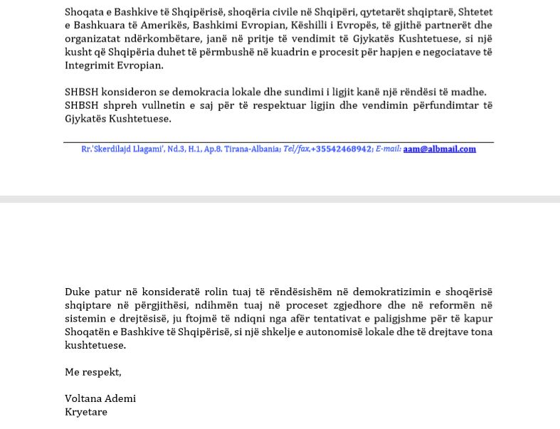Duke patur në konsideratë rolin tuaj të rëndësishëm në demokratizimin e shoqërisë shqiptare në përgjithësi, ndihmën tuaj në proceset zgjedhore dhe në reformën në sistemin e drejtësisë, ju ftojmë të ndiqni nga afër tentativat e paligjshme për të kapur Shoqatën e Bashkive të Shqipërisë, si një shkelje e autonomisë lokale dhe të drejtave tona kushtetuese.