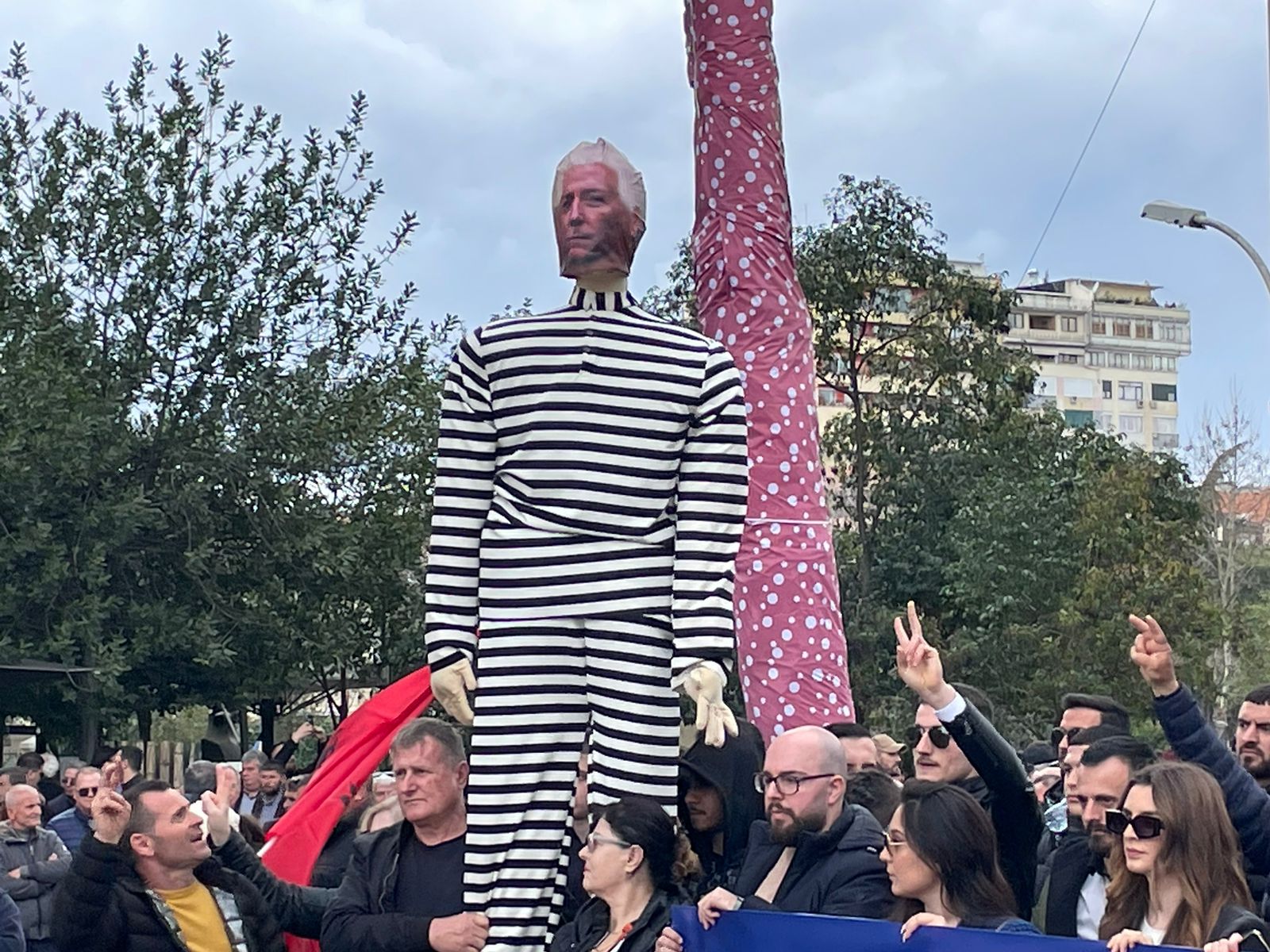 Pankarta nga protesta e opozitës: Manekinë të veshur me veshje të burgosurish e foto të Ramës