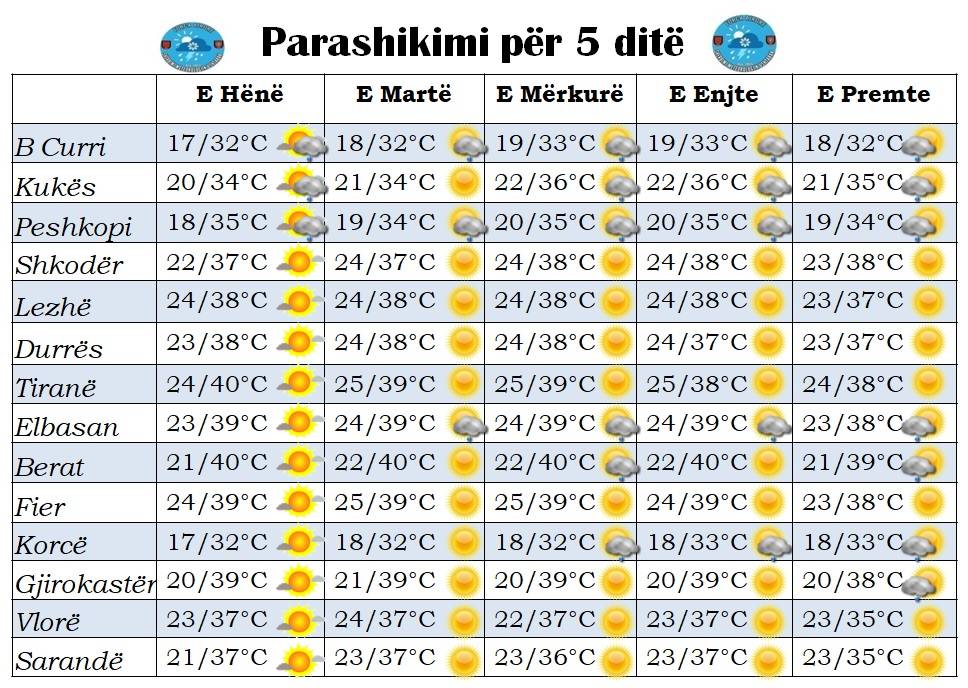 Sipas parashikimit nga SHMU në relievet kodrinore – malore, orët e mesditës deri ato të pasdites vonë do të ketë edhe alternime vranësirash kalimtare të cilat mund të shoqërohen me reshje shiu me intensitet kryesisht të ulët por hera-herës.
